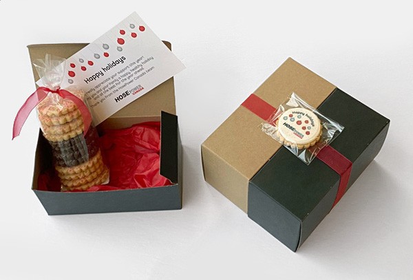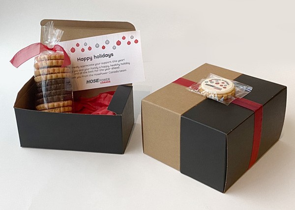Ensemble de deux boîtes de 12 sablés à la vanille et au chocolat réunies par un ruban d'organza et ornées d'un biscuit avec votre logo. À l’intérieur, une jolie carte de souhaits avec votre message et votre logo.