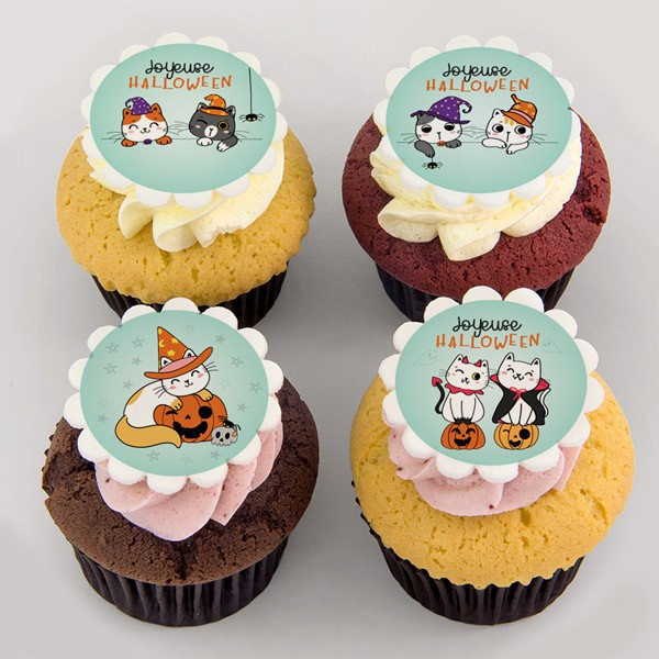 Cette série de cupcakes d'Halloween avec 4 mignons chats en impressions comestibles sur nos pastille de notre fondant maison saura mettre de la fantaisie dans votre événement.